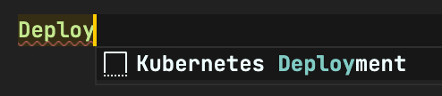 클러스터를 조작할 수 있는 다양한 기능들이 있지만, 우선 에디터 기능만 훑고 넘어가자. 익스텐션을 설치한 다음 YAML 파일에서 쿠버네티스 오브젝트의 앞 글자를 입력하면 아래 이미지와 같이 템플릿이 제공된다.
