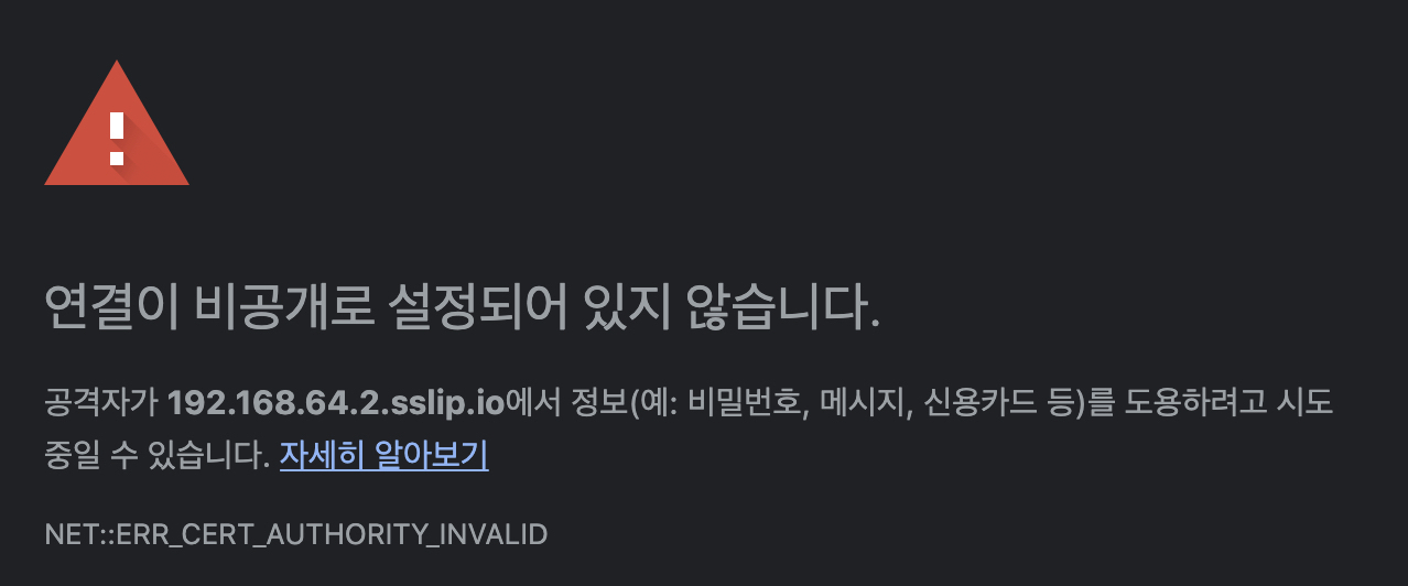 이제 해당 주소로 접근하면... 아래와 같은 메시지가 나오는데, 정상적인 것이니 걱정하지 말자. TLS 인증서는 제대로 설정되었다! 다만 CA(Certificate Authority)에서 인증받지 않은 인증서라 경고를 하는거다.